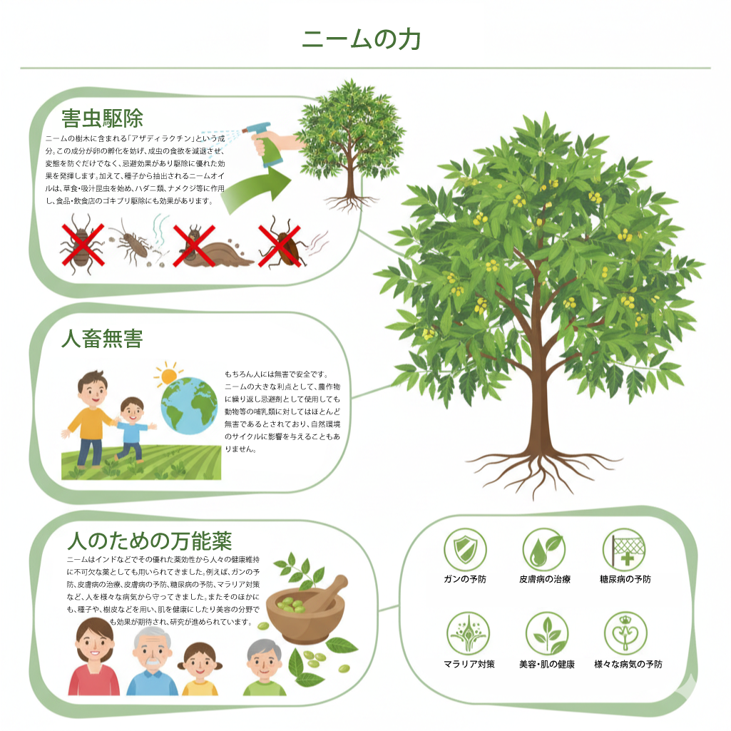 ニームは防虫効果のほかに、私たち人間の健康に役立つさまざまな薬効も、認められています。化学物質による環境汚染が、私たち人類の大きな問題になってきている現代。20世紀最大の自然の恩恵と言われるニームこそ、私たちの健康と自然環境の保全に欠かせない存在であると考えています。これを実現するため私たちはニームに関する情報を発信していきたいと思います。