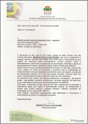 マット・グロッソ州サン・ジョゼ・ド・リオ・クラーロ市 市長Massao Paulo Watanabeは、アマゾンジャングルの保護 持続的植林事業と破壊された環境の修復、さらには人的開発といったAMAKAIが推進する活動の対象地に選定されるとの通知をいただいたことに、光栄なことと受け止め謝意を表します。